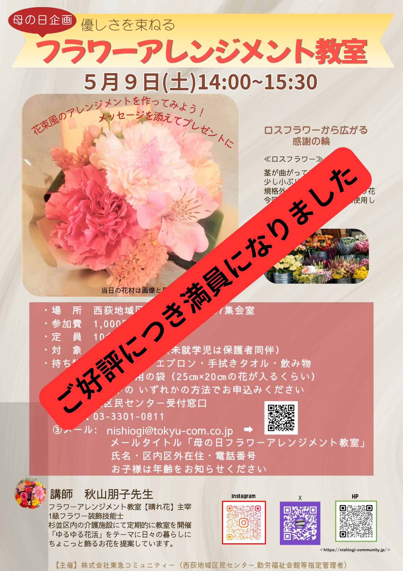 「母の日企画フラワーアレンジメント教室」はご好評につき満員となりました。 今後も楽しいイベントを企画してまいります。 SNSやHPを是非ご覧いただき、皆様のご参加をお待ちしております。